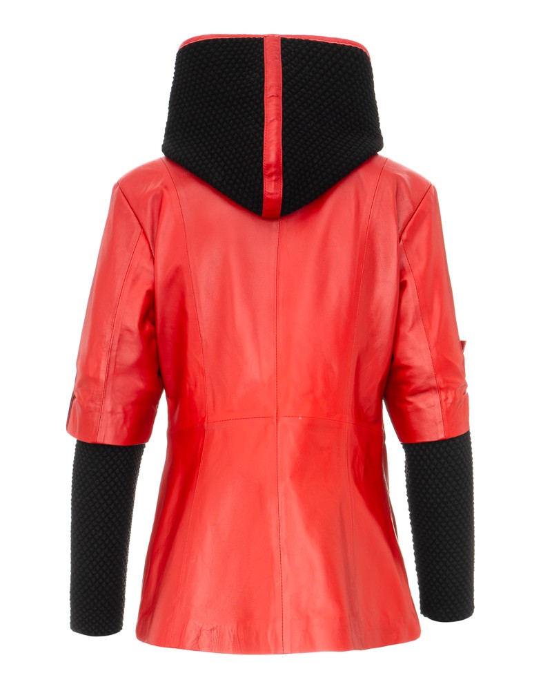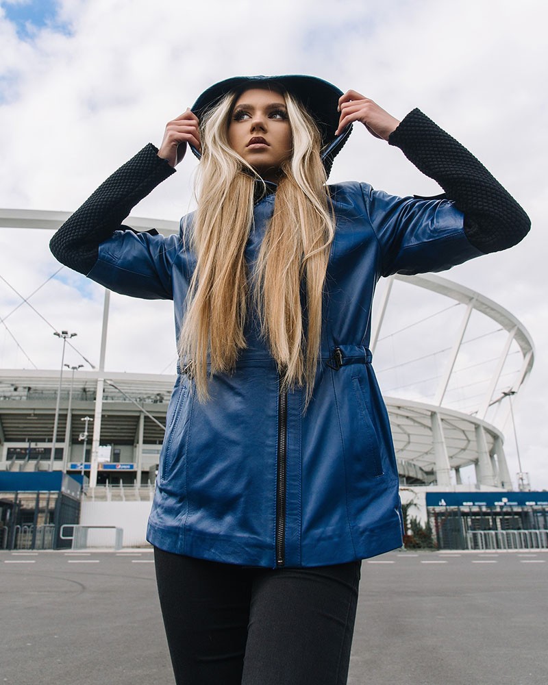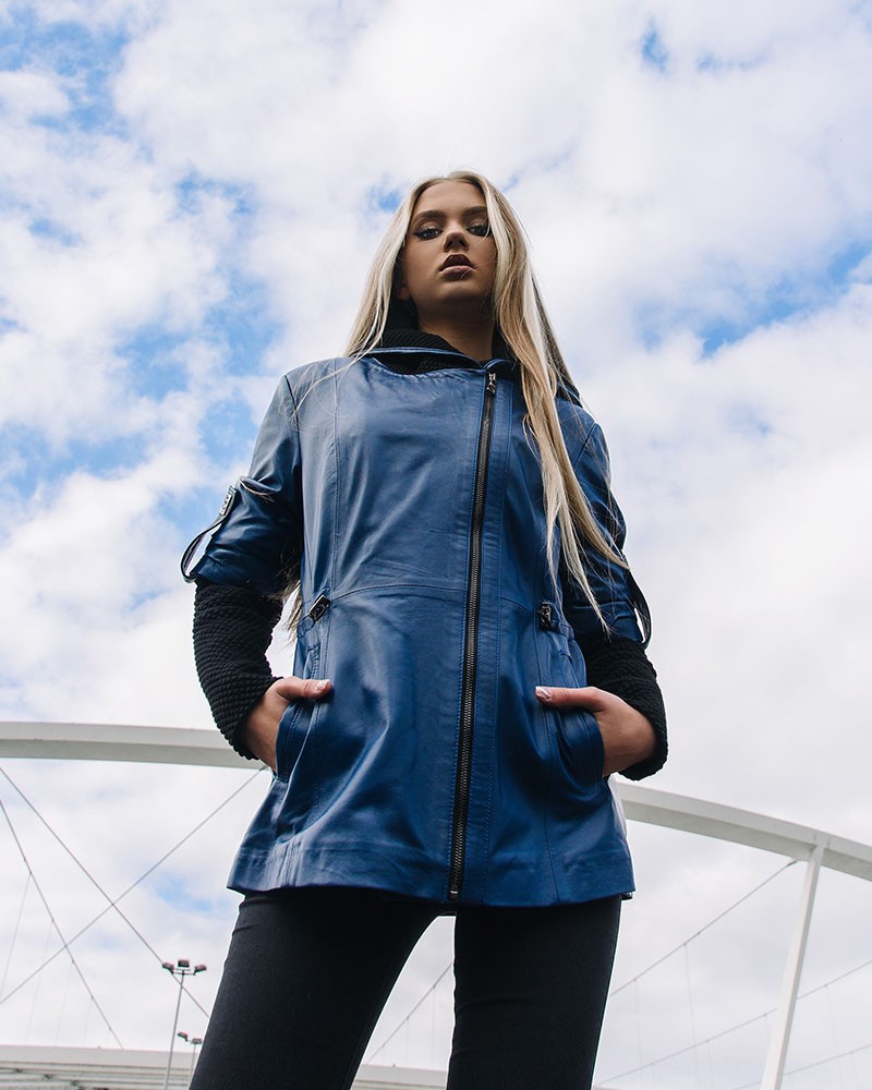 Dámská kožená bunda Bella má zajímavý design, který tvoří mimo jiné materiálové vsadky kontrastující barvou s ostatní částí projektu. Na rukávech jsou průhledné kovové ozdoby a mírně asymetricky vsazený zip dokonale ladí s celkem. Pokud se ochladí, můžete si na hlavu nasadit praktickou, pohodlnou kapuci. Bunda má ženský, mírně pasovaný střih a délku až k bokům. Využijte šňůrky v pase, sloužící k regulaci obvodu, a výrazněji zvýrazníte křivky své postavy.