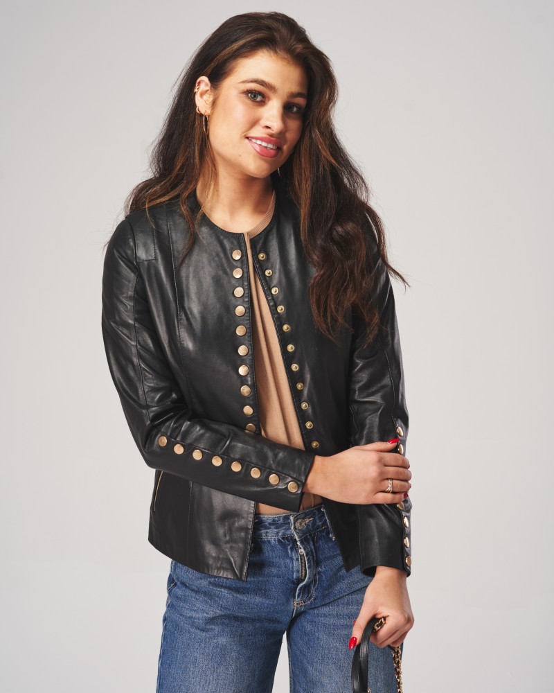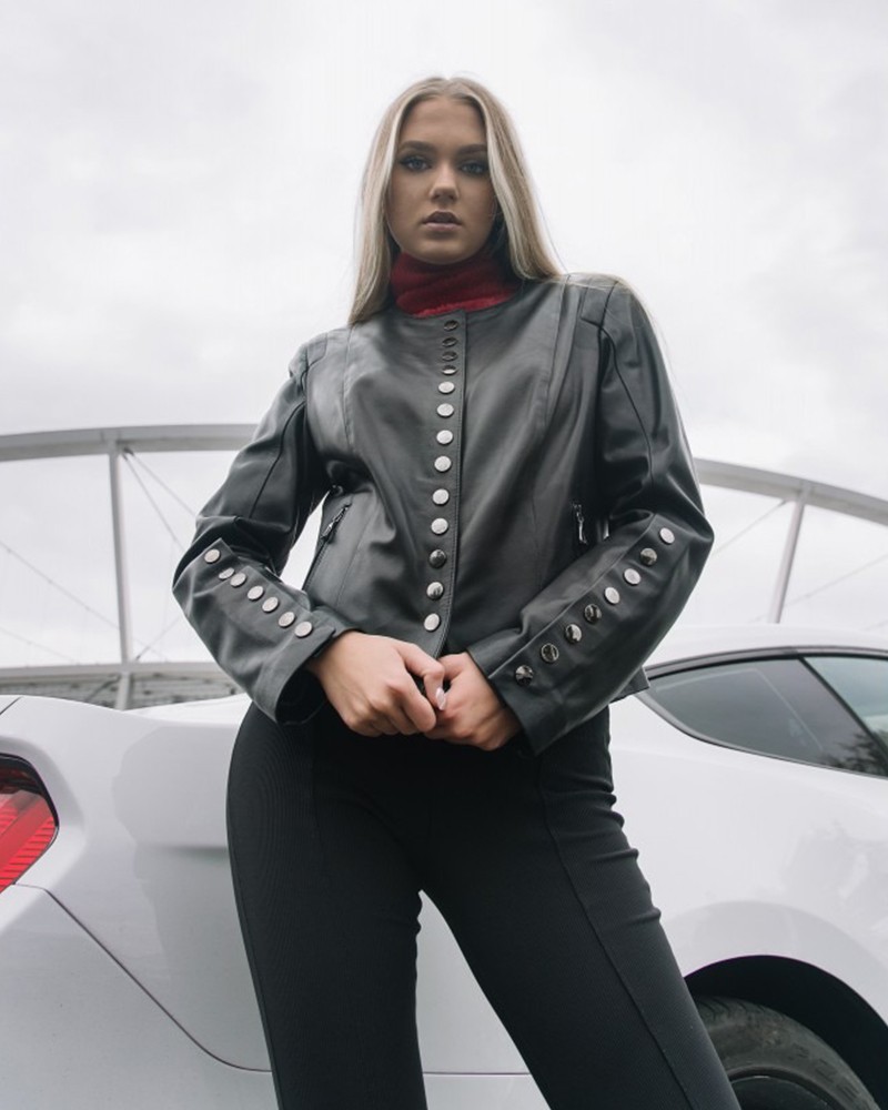 Dámská kožená bunda Esmeralda se zapíná na barevně kontrastní ozdobné patentky, které se nacházejí i u rukávů. Právě ty vytvářejí jedinečný charakter modelu a dodávají mu neobvyklou výjimečnost. Dvě praktické boční kapsy se zapínají na odolný zip z nerezové oceli a jsou ideální pro schování rukou, když je trochu chladněji.