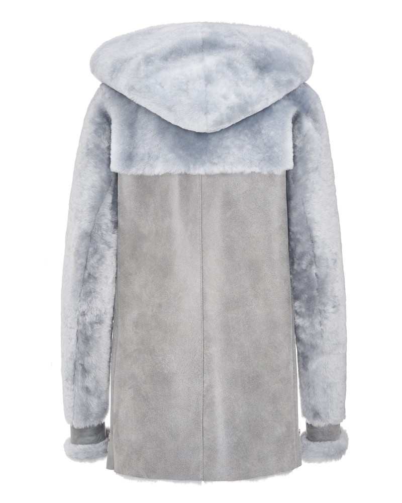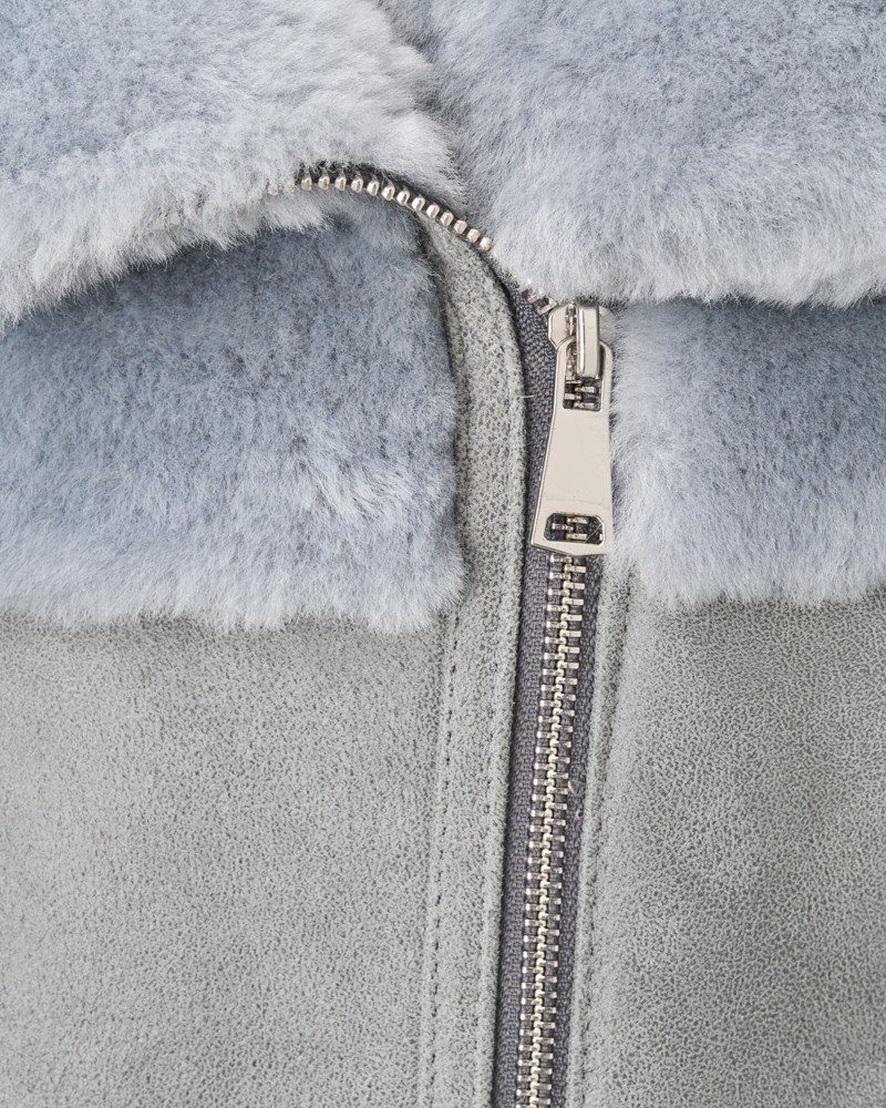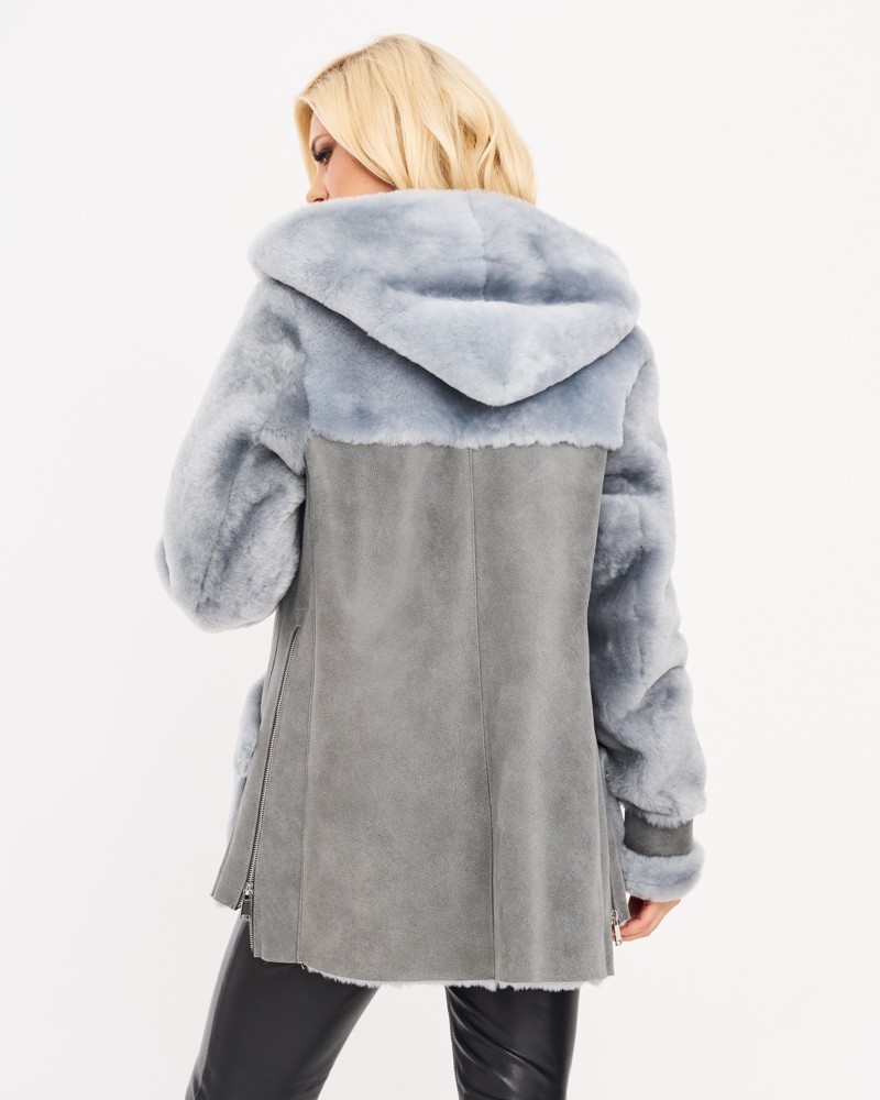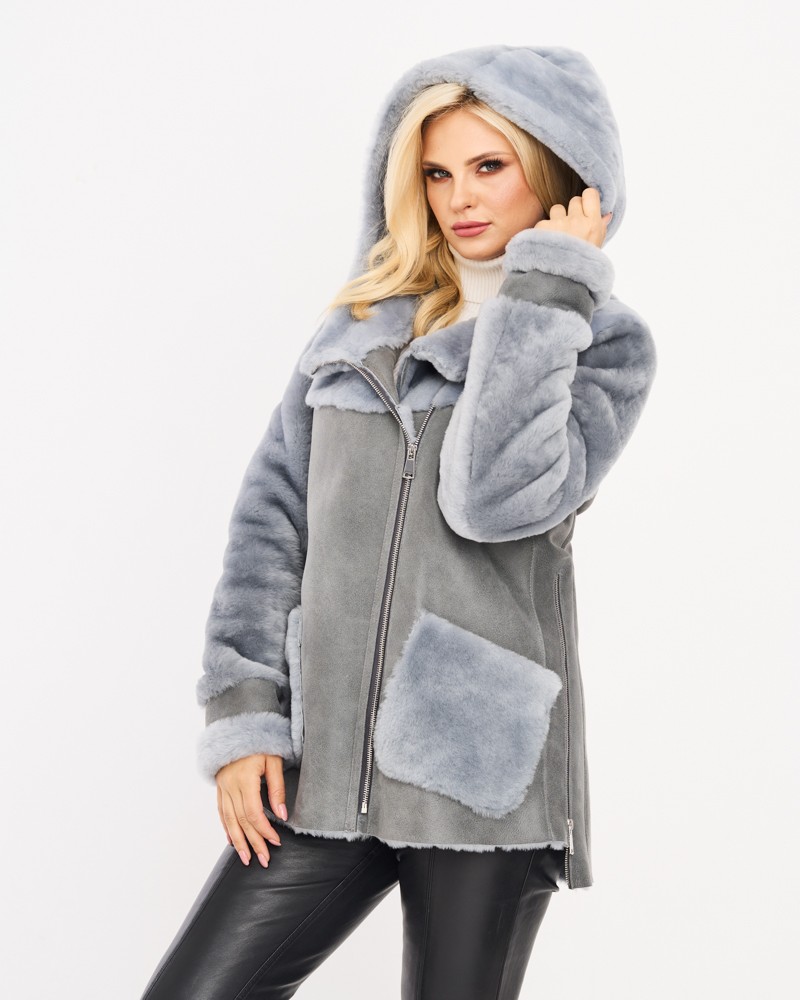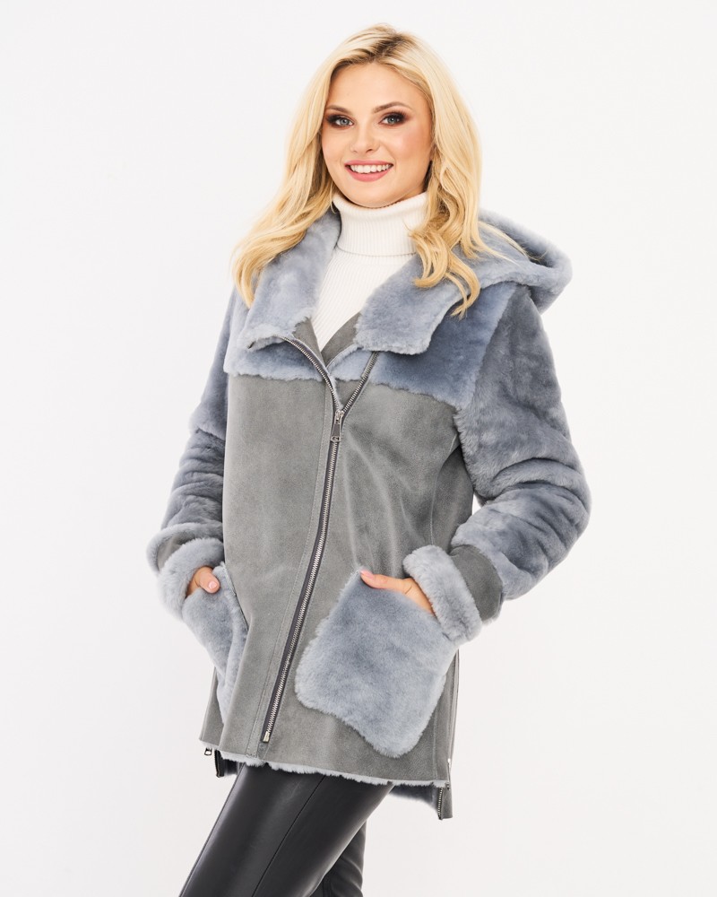 Přírodní dámský kožich Alexis v šedé barvě byl ušit z mimořádně teplé a na poškození odolné přírodní ovčí kůže, proto je ideální na zimu. Vsadky v šedém odstínu, vytvořené z přírodního, hebkého kožíšku, pozitivně působí na design modelu, dodávajíce mu výjimečný charakter. Kožich má lehce asymetrickou délku – zadní část je jemně prodloužená – a končí přibližně na úrovni boků. Díky tomu model umožní zvýraznit jejich tvar, obzvlášť pokud k němu zvolíte více přiléhavé kalhoty.