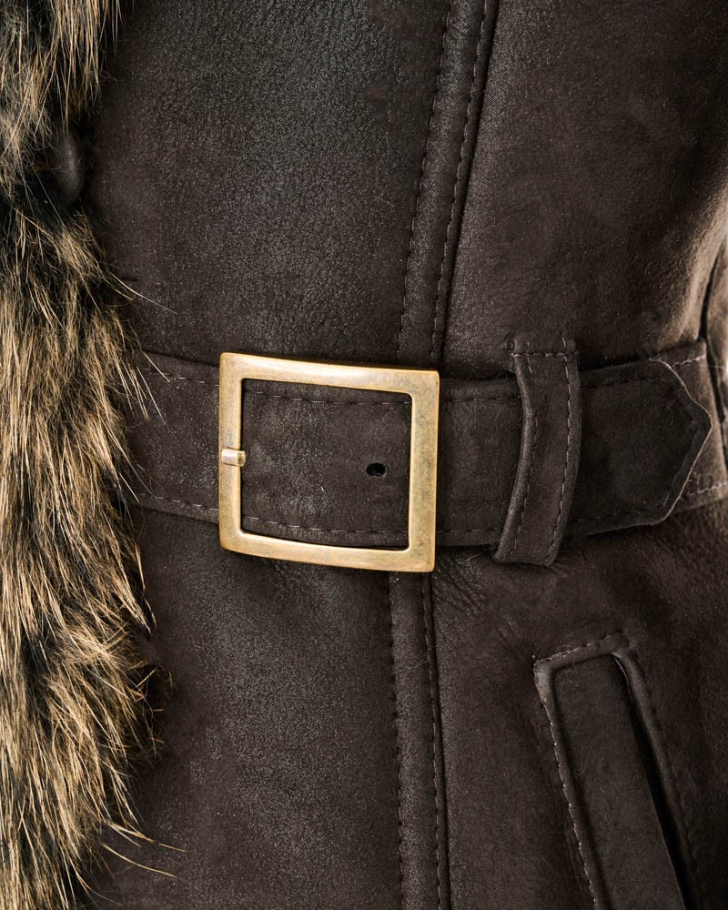 Dámský kožich Karen je ušitý z přírodní ovčí kůže, která poskytuje teplo, vysoký tepelný komfort a prodyšnost. Je dlouhý, sahá až do poloviny lýtek, a proto skvěle chrání před chladem i spodní části těla. Model se zapíná na praktické, pevně přišité knoflíky. V pase je pásek s elegantní sponou, kterým dokonalé zvýrazníte postavu. Projekt doplňují dvě praktické boční kapsy a u rukávů regulace ve formě pásku se sponou.