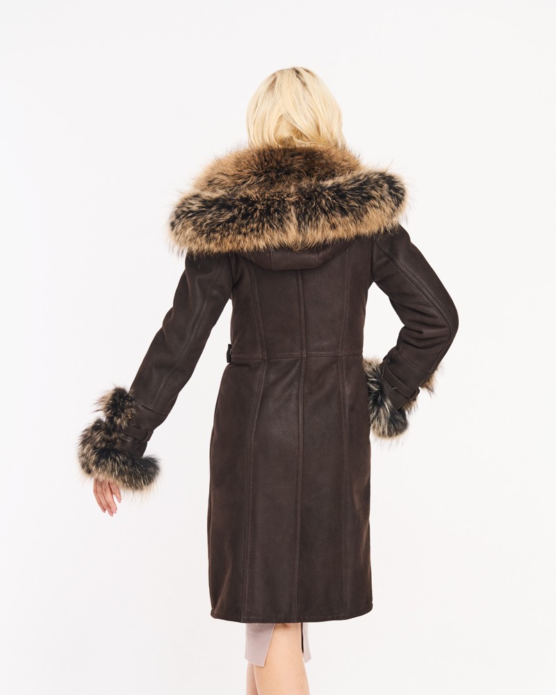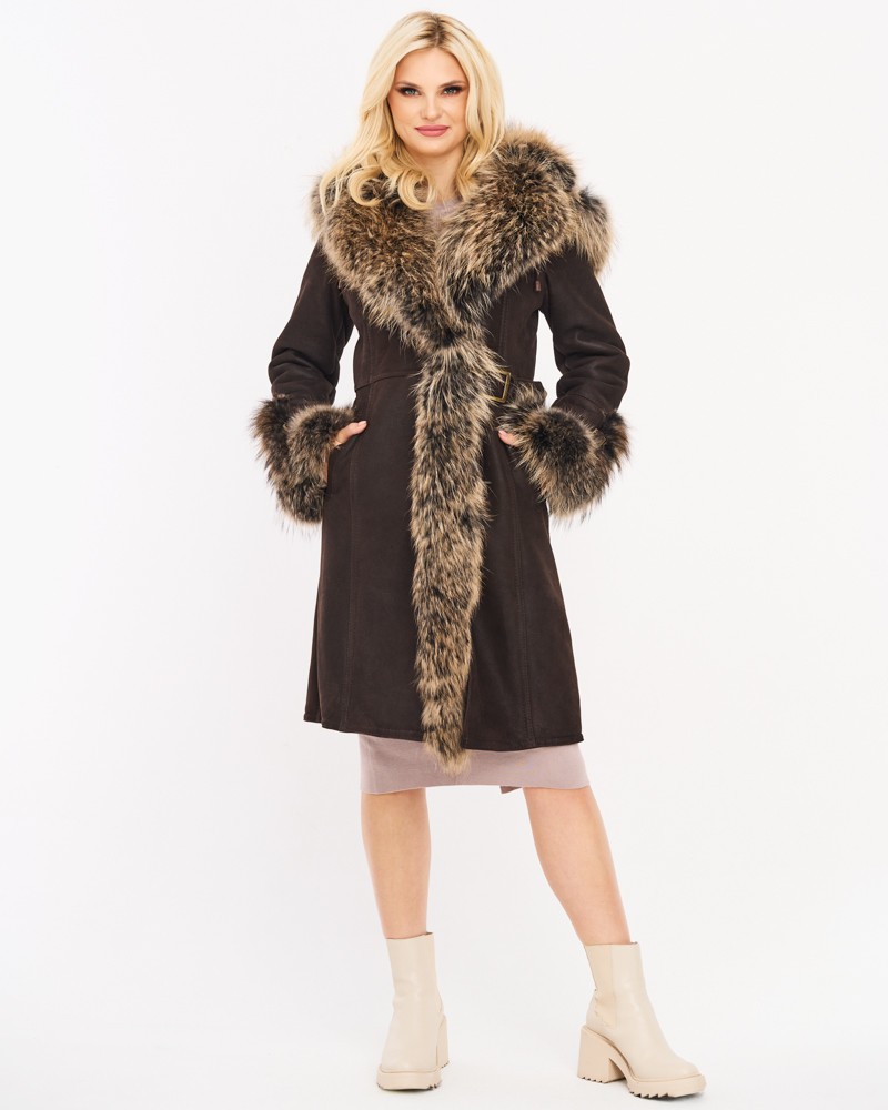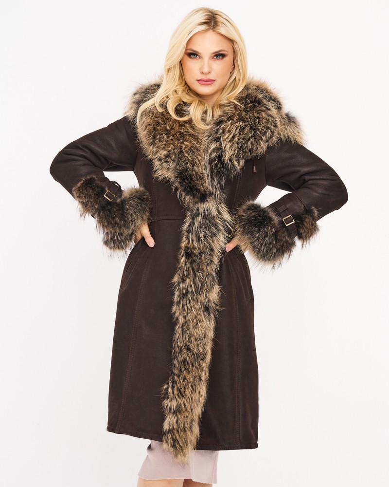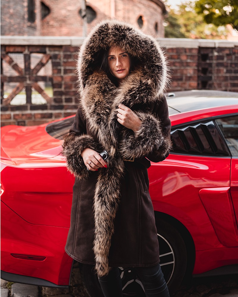 Přírodní dámský kožich Karen byl ušit z přírodní ovčí kůže, která zaručuje teplo a dlouholetou odolnost. Manžety rukávů, kapuce a lem modelu jsou zdobené přírodním mývalovcem, který vytváří spektakulární vizuální efekt a zároveň zlepšuje termoizolační vlastnosti kožichu. Délka sahající ke kolenům opticky zeštíhluje postavu a boční kapsy dodávají celku funkčnost a praktičnost.
