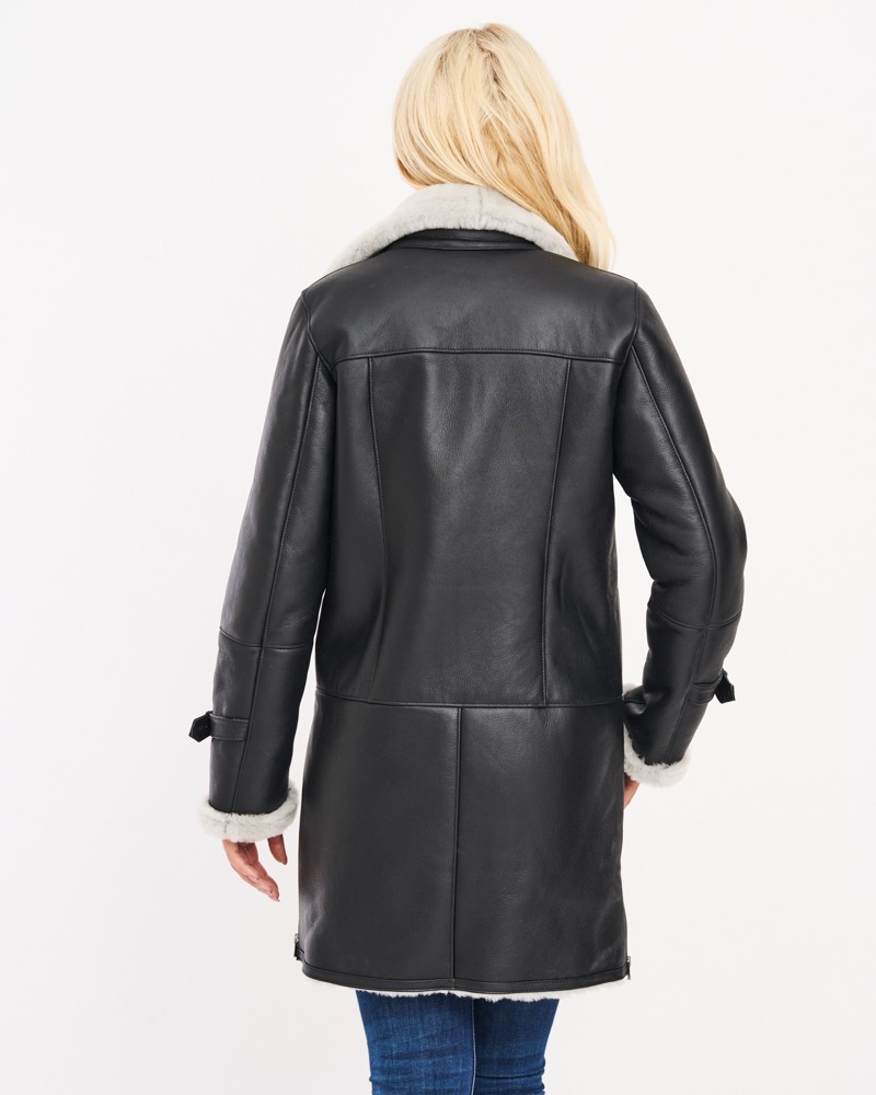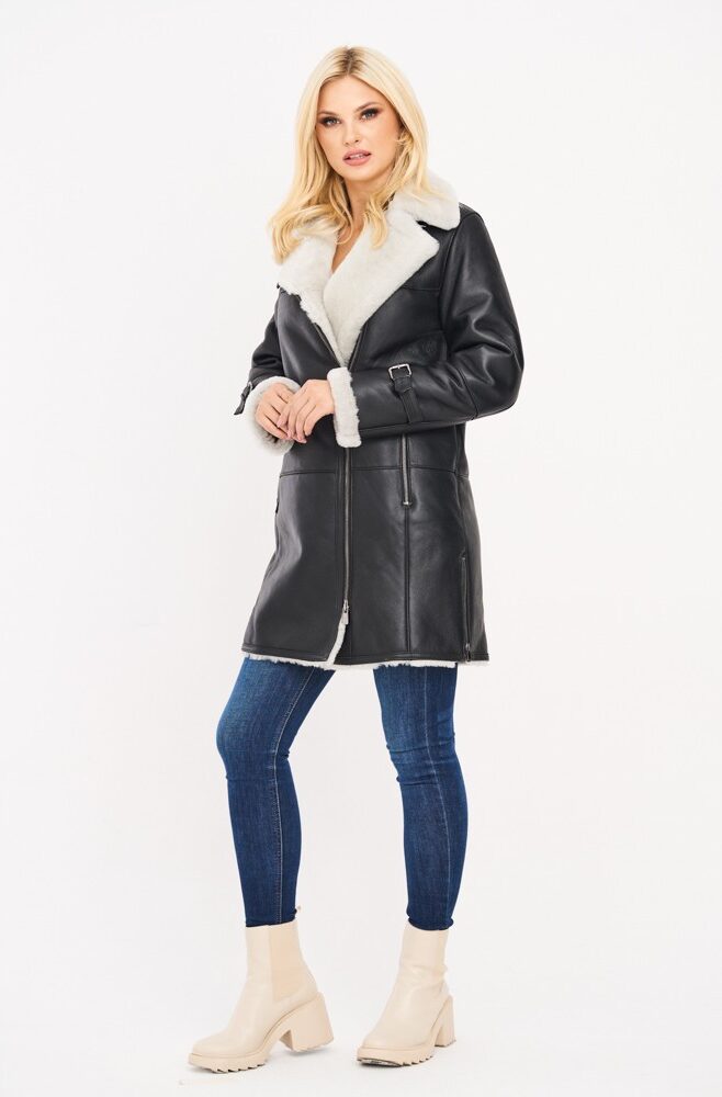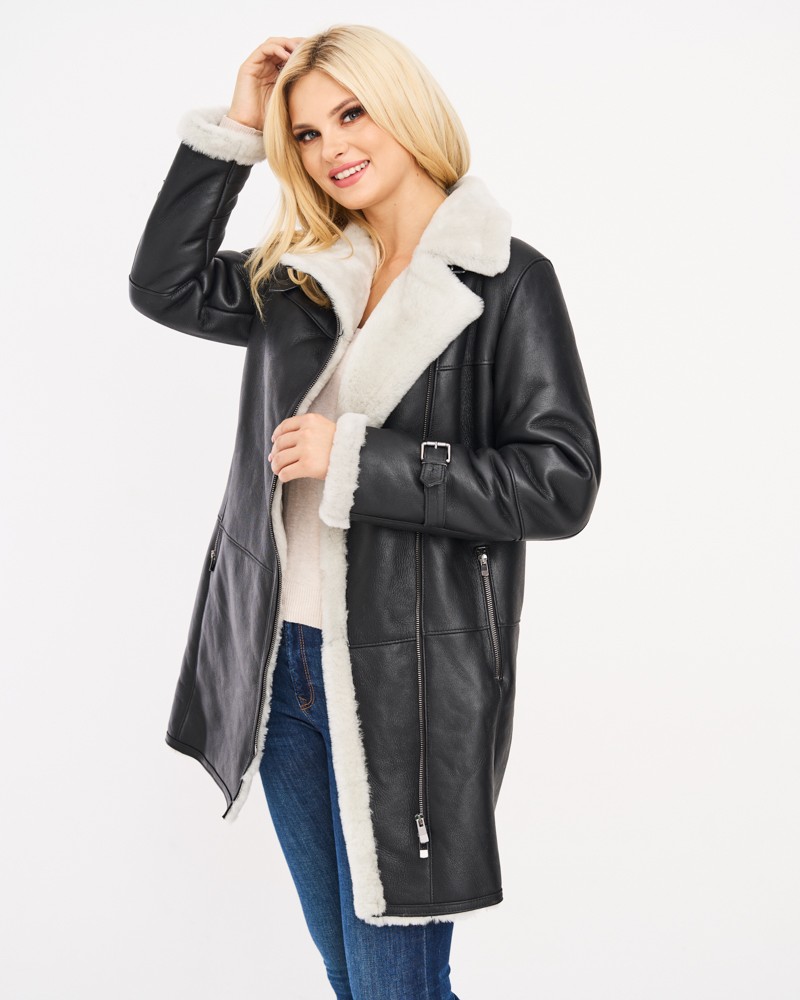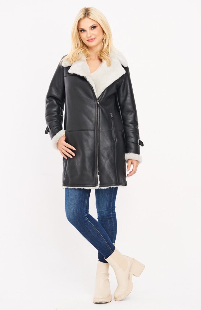 Dámský kožich Lidia je vybaven výklopným límcem se širokými klopami, který působí velmi honosně, a je měkký a příjemný na dotek. Stejným kožíškem byly ozdobeny manžety dlouhých, rovných rukávů, které jsou nad manžetami doplněny páskem s přezkou z nerezové oceli. Dvě boční kapsy, zapínané rovněž na zipy, dokonale ladí s celkem. Originální prošívání dodává kožichu jedinečný charakter. Tento model je skvělou volbou na chladné podzimní a zimní dny.