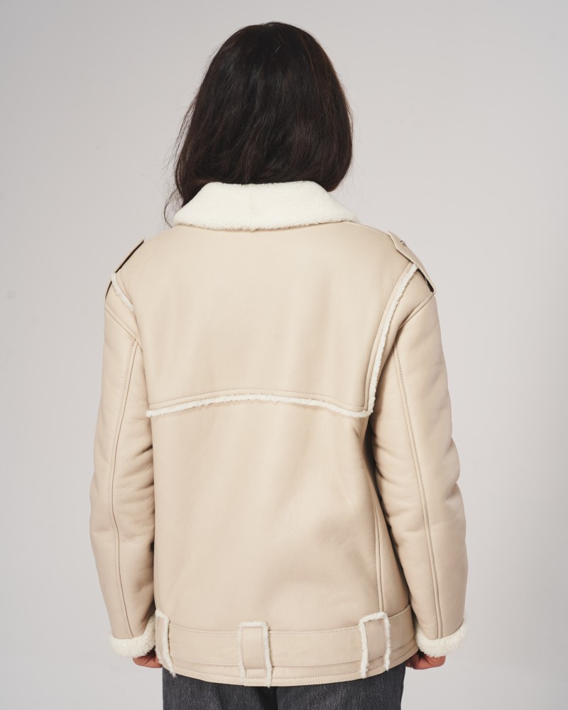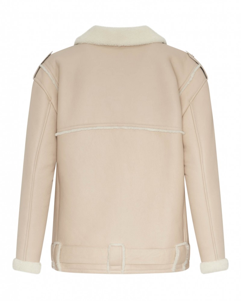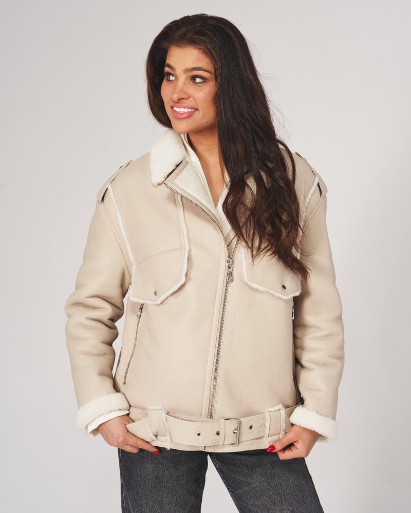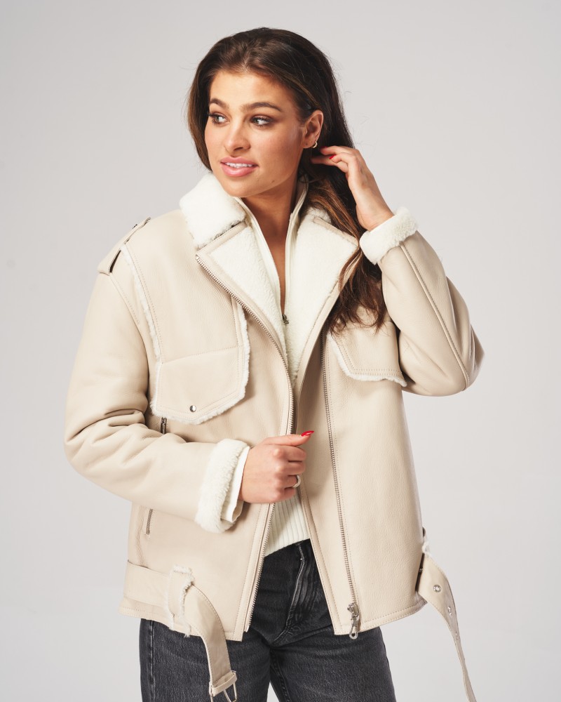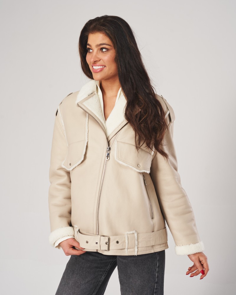 Dámský kožich Liza je laděn do teplé, světlé barevné škály, proto perfektně doplní mnoho zimních outfitů. Byl střižen v nadčasovém oversize střihu, který zajišťuje maximální pohodlí při nošení, volnost pohybu a komfort, zároveň umožňuje obléct pod něj silnější vrstvy oblečení. Na spodní části je pásek sladěný s celkem a vybavený sponou, který slouží k regulaci obvodu pro lepší přizpůsobení modelu postavě.