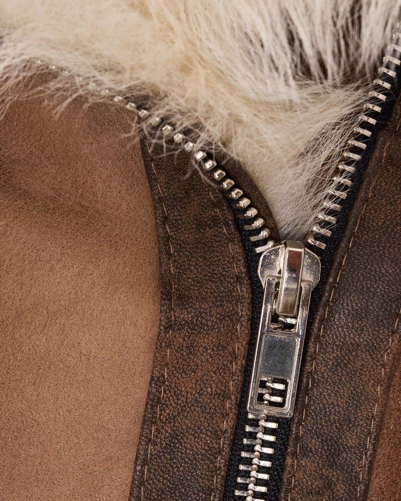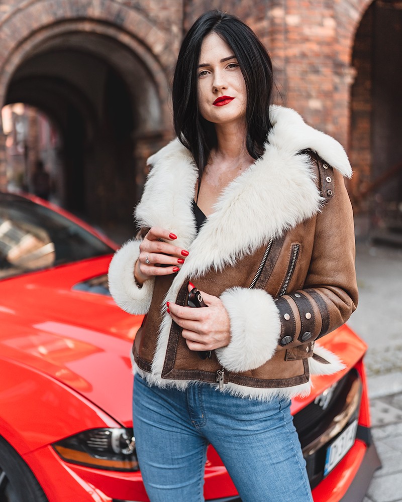Přírodní dámský kožich Takaszi se vyznačuje neotřelým designem, ve kterém atraktivní, tmavě hnědé pásy s cvočky u rukávů a ve spodní části působivě barevně kontrastují s celým projektem. Model je zapínán na našikmo všitý odolný zip z nerezové oceli, stejně jako kapsy umístěné v úrovni hrudi. Volný střih a délka končící na úrovni boků perfektně sedí na postavě a jemně zvýrazňuje přednosti ženské figury.