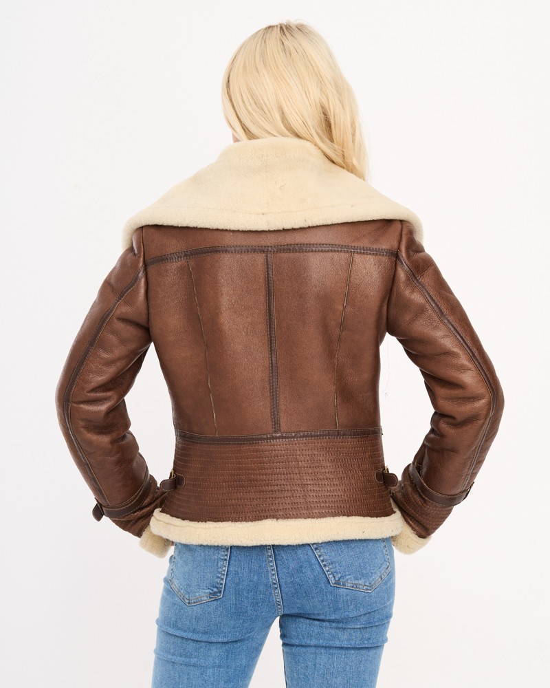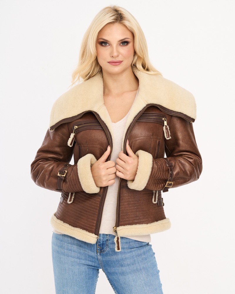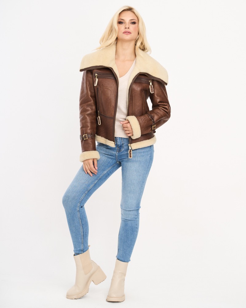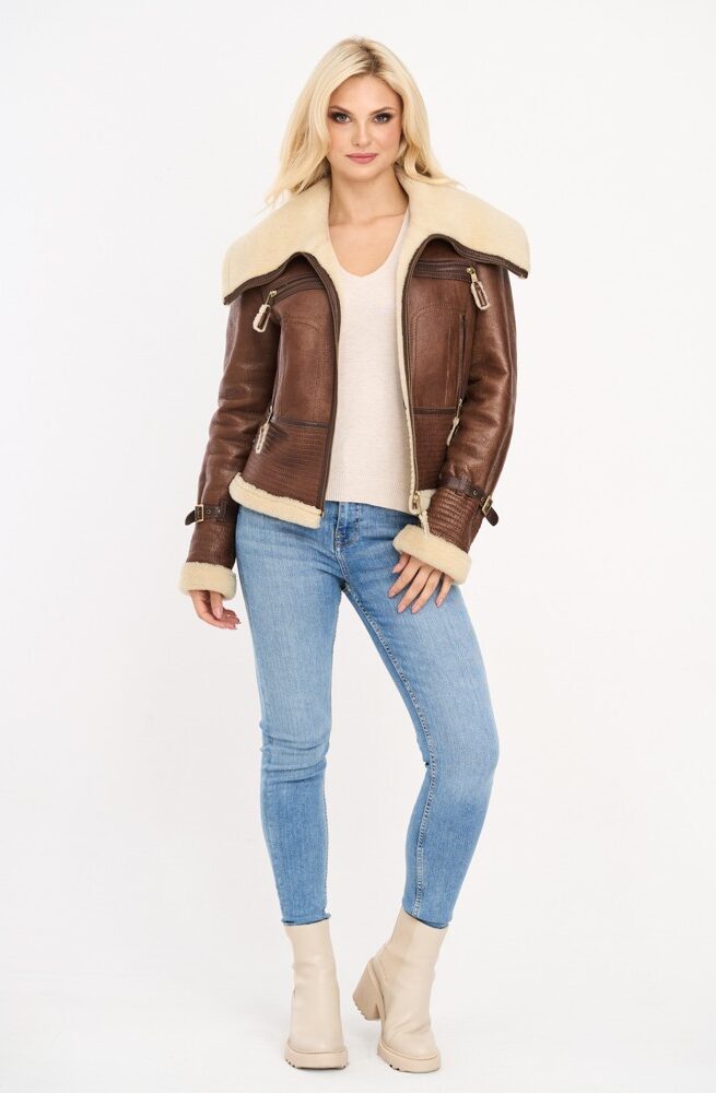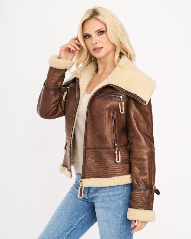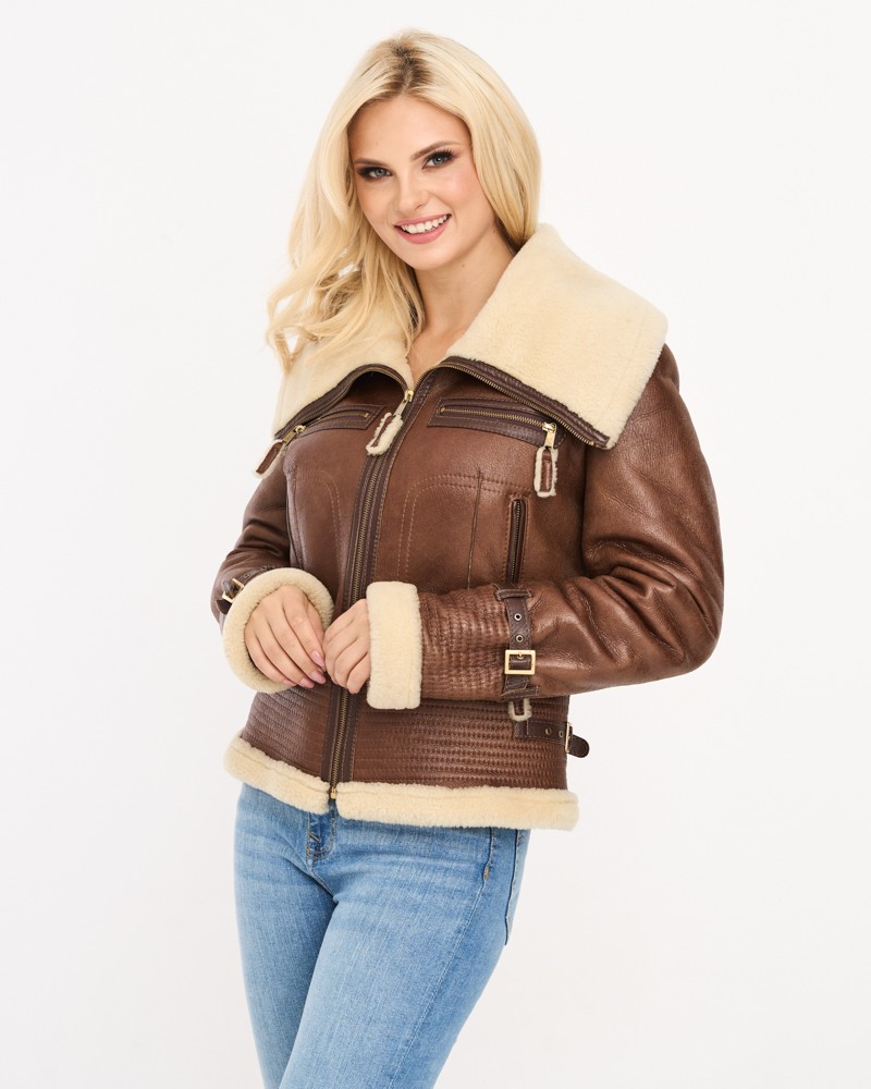 Přírodní dámský kožich Victoria má lehce projmutý střih a délku sahající nad boky, díky čemuž perfektně sedí na postavě a opticky ji zeštíhluje. Ve spodní části po stranách jsou pásky s přezkou umožňující ideální přizpůsobení modelu své postavě. Spodní lem kožichu, manžety rukávů a vykládaný límec okouzlují použitím vnitřní vrstvy kožíšku, která oživuje celý projekt. Model byl ušit z nejkvalitnější, 100% přírodní ovčí kůže, která je zárukou jedinečného tepelného komfortu a mnohaleté trvanlivosti.