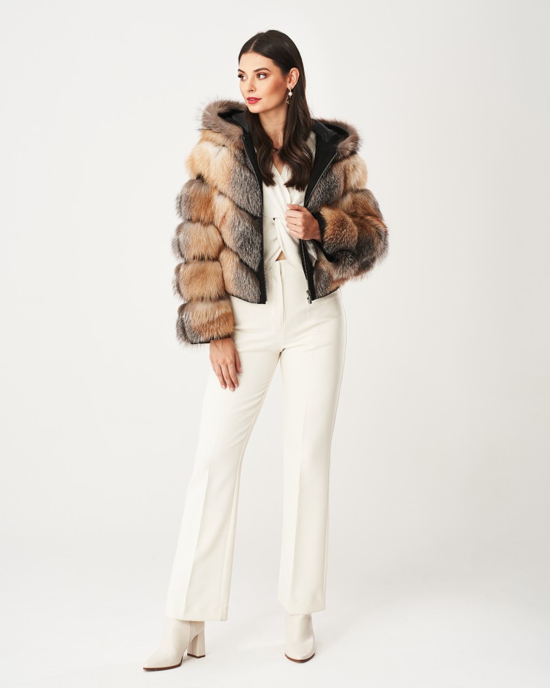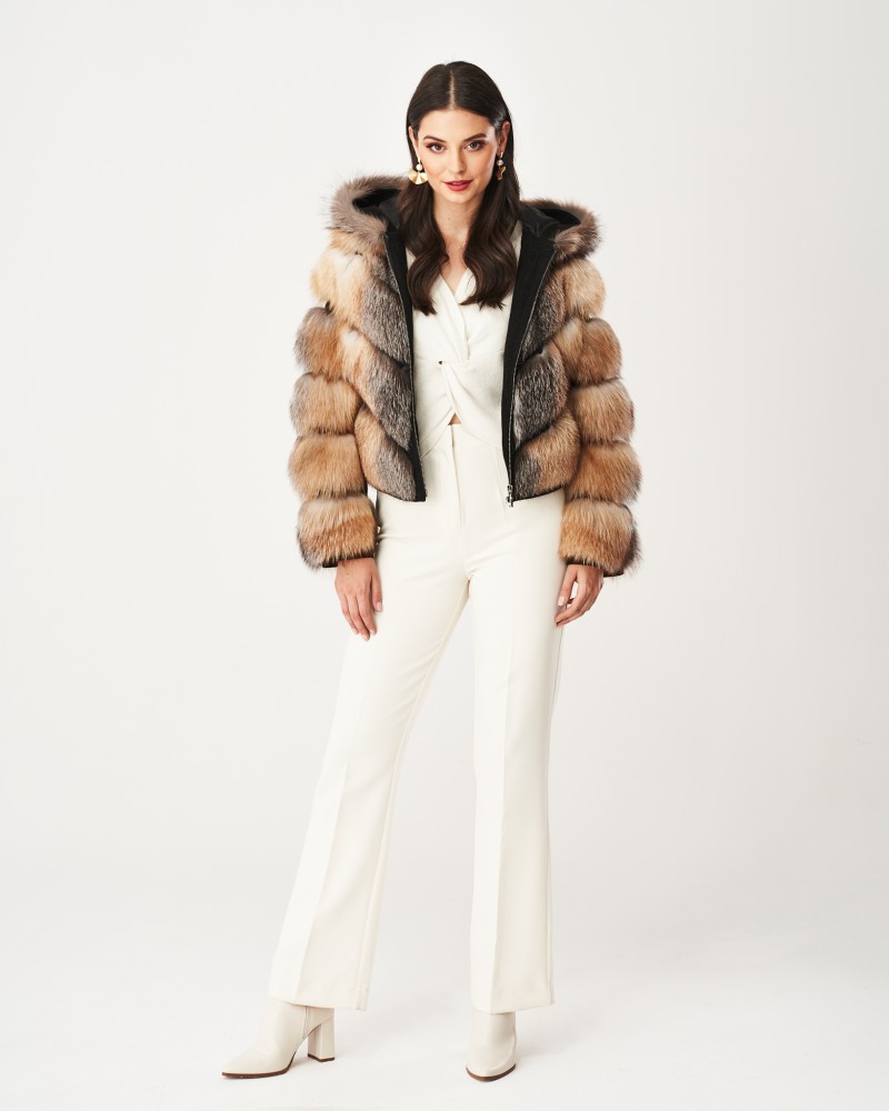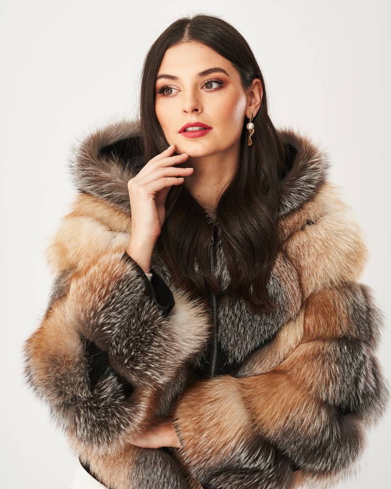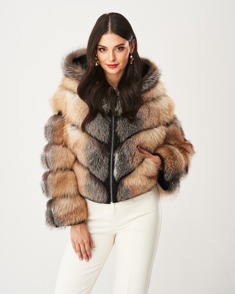 Kožešinová bunda Luxuria je navržena s délkou sahající k bokům, se zadní částí o něco delší než přední. Prostorná kapuce zabrání úniku tepla hlavou. Dlouhé, rovné, nadýchané rukávy z kožešiny a lemování plynule fungujícího zipu je dokončeno měkkou jehněčí lícovou kůží. Originální design bundy, skládající se ze širokých pásů běžících šikmo, dává modelu jedinečný charakter. Tento velmi ženský a vybraný střih zdůrazňuje přednosti ženské postavy. Bunda je celá zapínaná na spolehlivý a odolný nerezový zip, díky čemuž ještě účinněji zabraňuje úniku tepla během mrazivých dnů.