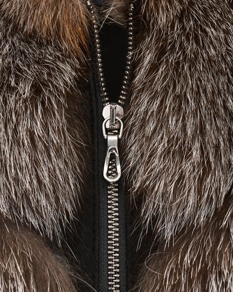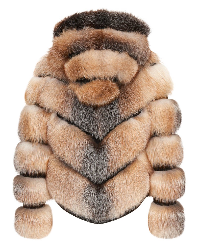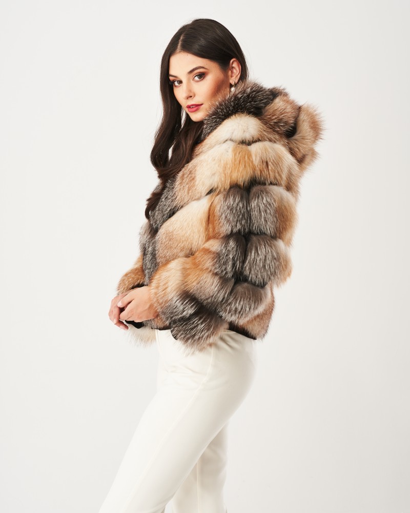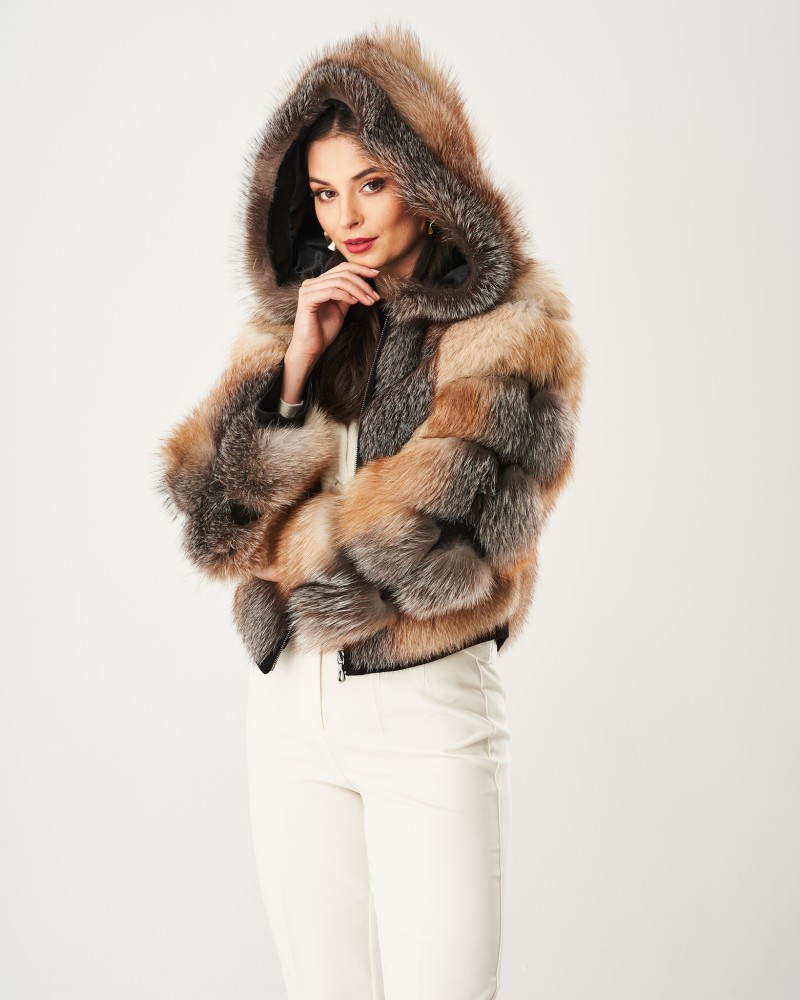 Kožešinová bunda Luxuria je navržena s délkou sahající k bokům, se zadní částí o něco delší než přední. Prostorná kapuce zabrání úniku tepla hlavou. Dlouhé, rovné, nadýchané rukávy z kožešiny a lemování plynule fungujícího zipu je dokončeno měkkou jehněčí lícovou kůží. Originální design bundy, skládající se ze širokých pásů běžících šikmo, dává modelu jedinečný charakter. Tento velmi ženský a vybraný střih zdůrazňuje přednosti ženské postavy. Bunda je celá zapínaná na spolehlivý a odolný nerezový zip, díky čemuž ještě účinněji zabraňuje úniku tepla během mrazivých dnů.