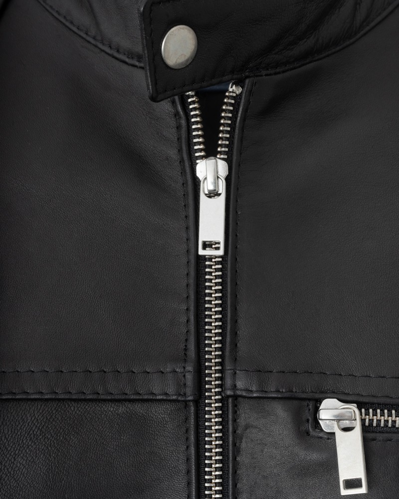 Pánská kožená bunda Jeremi je jemně prošívaná na ramenou, sedle a spodní části zad, což tvoří její jedinečný design a charakter. Atraktivitu modelu doplňují stylové detaily v podobě stojáčku zakončeného praktickým patentem, díky němuž se účinněji ochráníš před chladem, a dekorativní zipy, vsazené šikmo do rukávů.