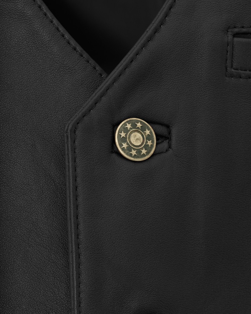 Pánská kožená vesta Anton vám umožní vytvořit vlastní, jedinečný image, který se stane vaším poznávacím znakem. Co je na vestě Anton tak výjimečného, že stojí za pozornost? Hned na první pohled je zřejmé, že střih je propracován do nejmenších detailů a odkazuje na klasickou eleganci minulosti. Dolní okraje jsou vykrojeny do trojúhelníků a tři vnější kapsy mají minimalistický vzhled. Vyniká zde vzácně se vyskytující zapínání v jiných kožených vestách – 4 mosazné knoflíky dodávající celku oldschoolový vzhled.