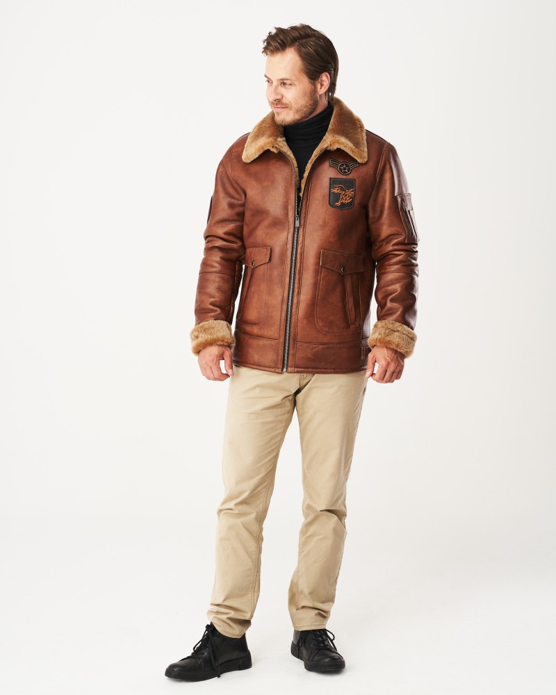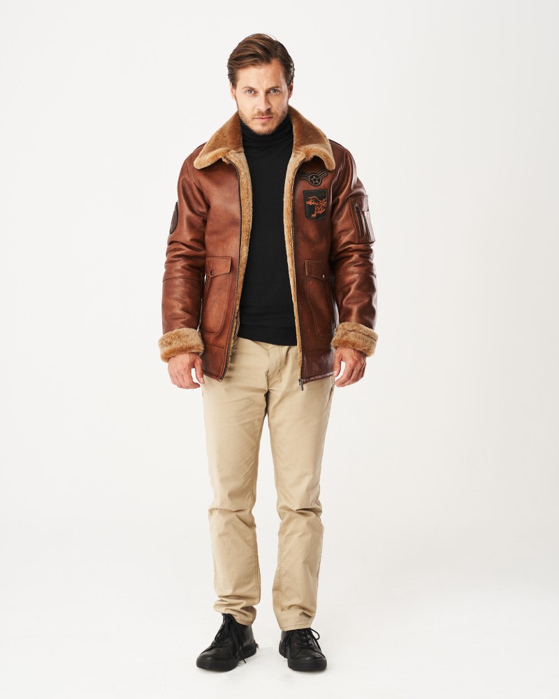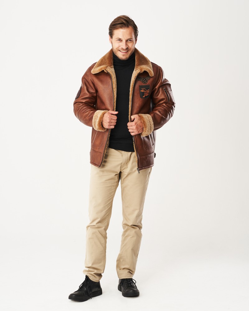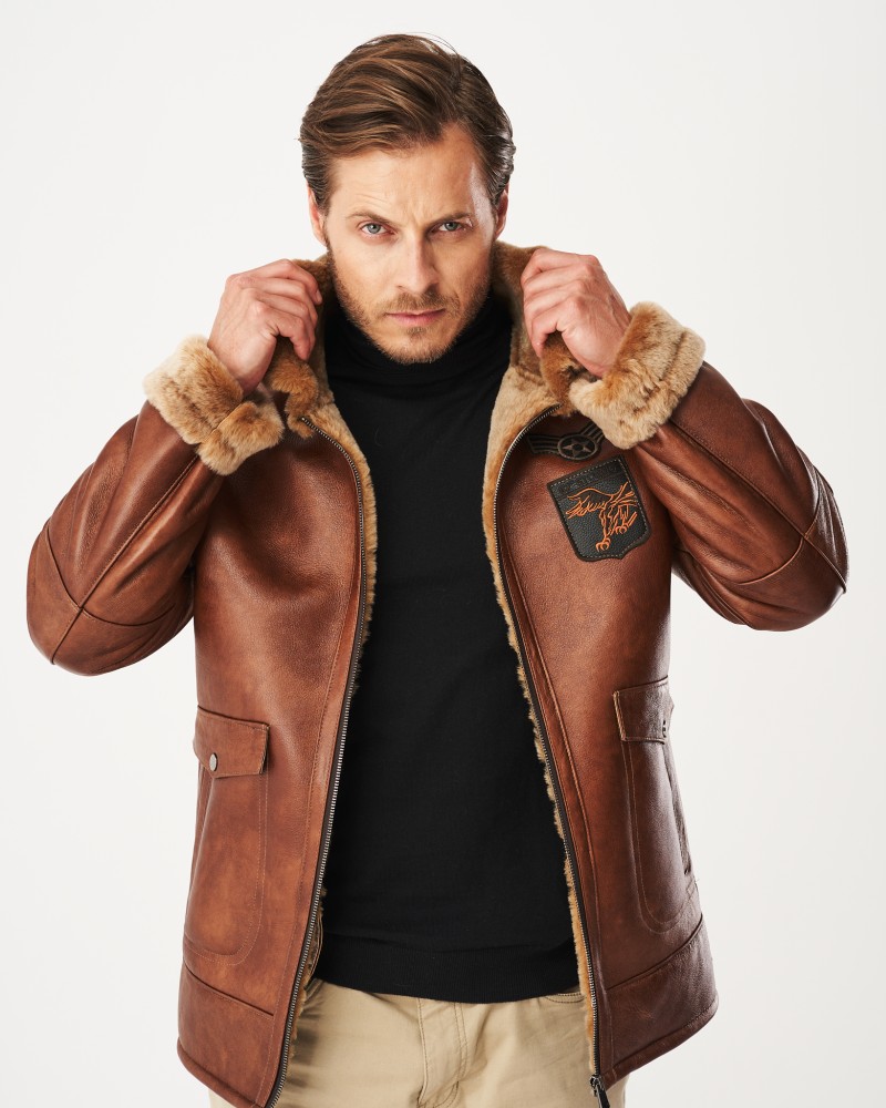 Pánský kožich pilotka Kevin je střižen v klasickém střihu, v délce do boků, čímž zvýrazňuje mužské přednosti postavy. Navíc výrobek zajišťuje volnost pohybu, nádech nonšalance a mnoho lehkosti. Celý zapínaný na odolný nerezový zip, vyznačuje se výjimečnou funkčností. Zadní část kožichu zdobí geometrické prošívání, a kožený pás všitý dole je opatřen přezkou pro dokonalé přizpůsobení tělu. Velké dvojité kapsy s klopou zapínanou na druky se vyznačují praktickostí, umožňující ohřát zmrzlé ruce. Malá kapsička na rukávu podtrhuje sportovní charakter výrobku. Jak se sluší na americkou pilotku, model je vybaven také náramky zdobícími přední část a rukáv.