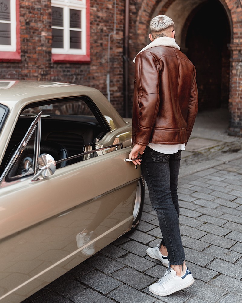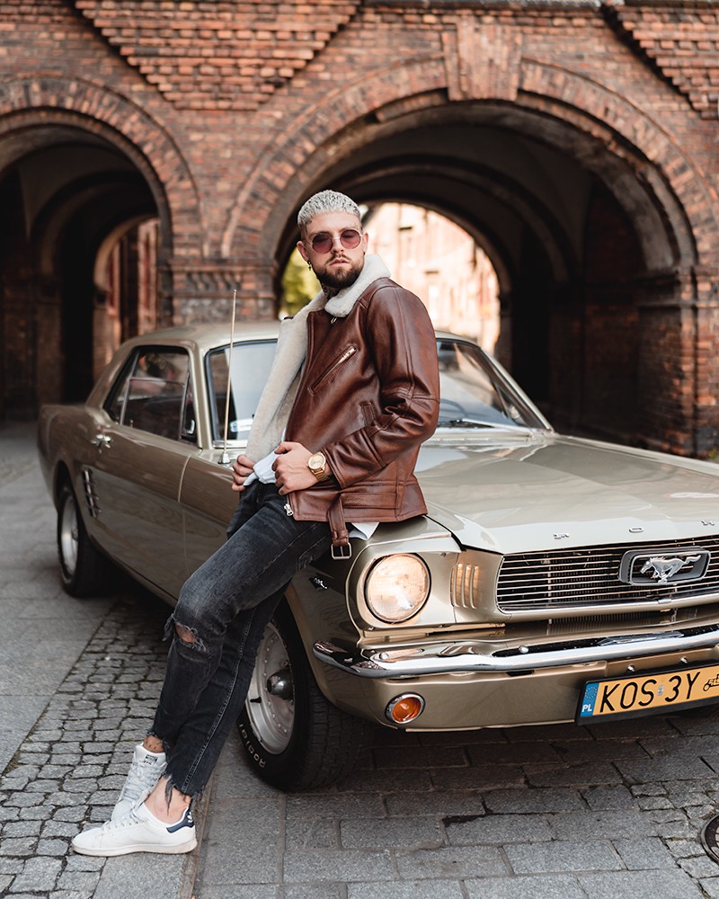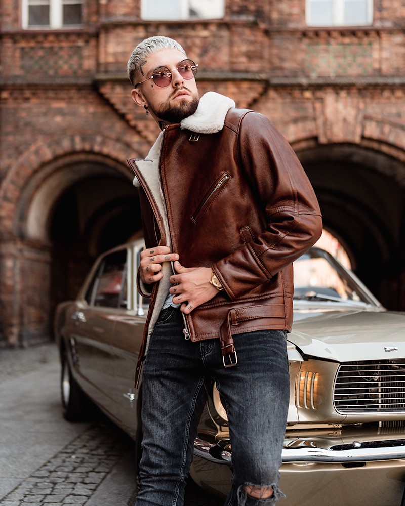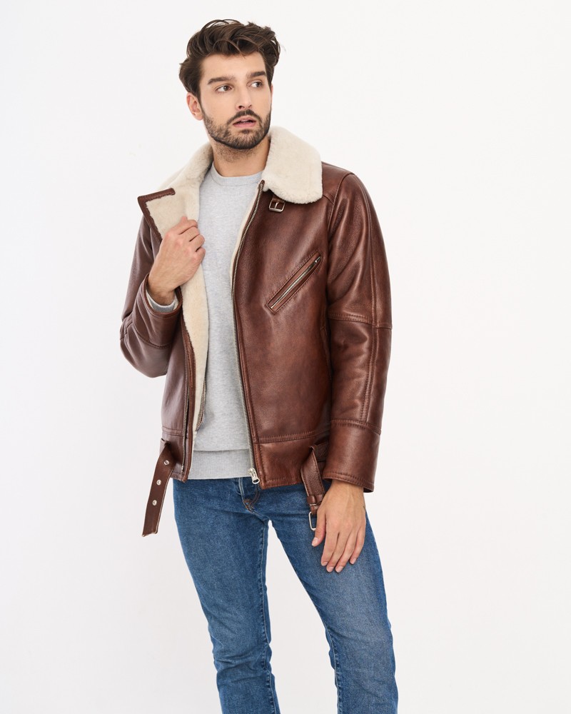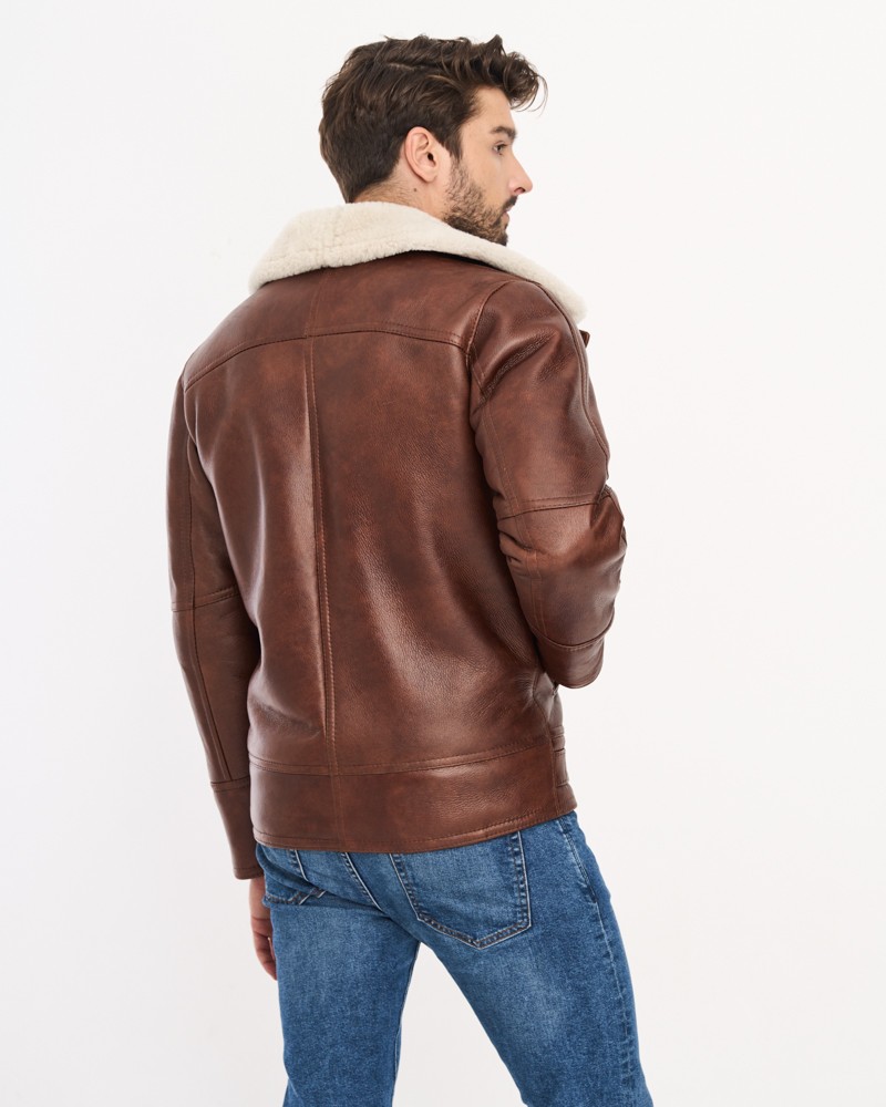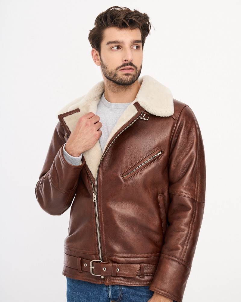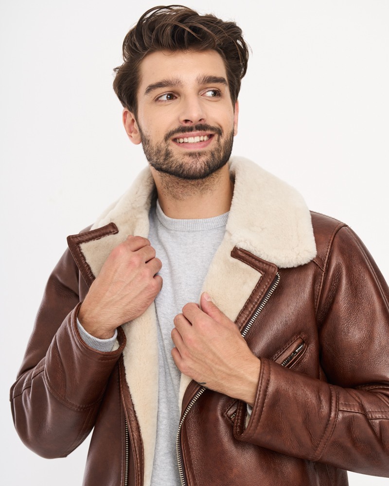 Pánský kožich Mateo byl ušit ve stylu ramonesky s délkou sahající k bokům, s rovnými rukávy doplněnými šikmými prošitími. Klopový, kožichový límec je příjemný a měkký na dotek, a přišitý pásek s kovovou přezkou plní nejen dekorativní funkci, ale umožňuje pevné zapnutí pod krkem. Kožich se zapíná na zip, který je vsazen mírně asymetricky a odpovídá nejnovějším módním trendům. Dvě boční kapsy jsou vsazeny tradičně, diskrétně zvýrazněné prošitím. Třetí kapsa, zapínaná na zip, je přišita šikmo na úrovni hrudníku.